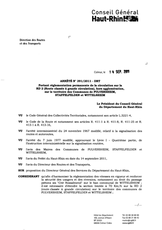 portant réglementation permanente de la circulation sur la RD 2 (route classée à grande circulation), hors agglomération, sur le territoire des communes de PULVERSHEIM, STAFFELFELDEN et WITTELSHEIM. Resumé Pièces jointes ARRETE Assemblée : Non défini Date : 14/09/2011 Rapporteur : Non défini Collectivité : Conseil départemental du Haut-Rhin Direction : Non défini Service : Direction des Routes Domaine : Circulation Commission :