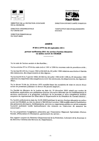 portant tarification 2011 du service d'action éducative en milieu ouvert de COLMAR. Resumé Pièces jointes ARRETE Assemblée : Non défini Date : 22/09/2011 Rapporteur : Non défini Collectivité : Conseil départemental du Haut-Rhin Direction : Non défini Service : Direction Enfance Santé Insertion Domaine : Prix de Journée Commission :