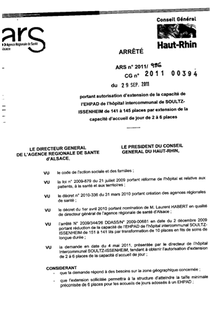 portant autorisation d'extension de la capacité de l'EHPAD de l'hôpital intercommunal de SOULTZ-ISSENHEIM de 141 à 145 places par extension de la capacité d'accueil de jour de 2 à 6 places. Resumé Pièces jointes ARRETE Assemblée : Non défini Date : 29/09/2011 Rapporteur : Non défini Collectivité : Conseil départemental du Haut-Rhin Direction : Non défini Service : Direction de l'Autonomie Domaine : Autres (non classés) Commission :