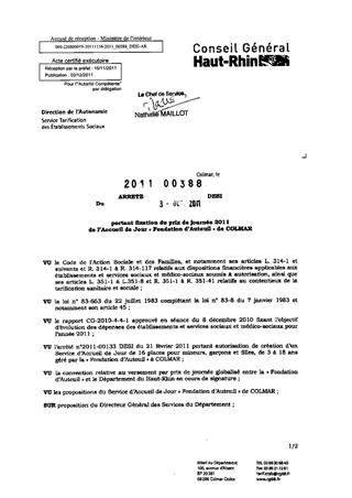 portant fixation du prix de journée 2011 de l'accueil de jour "Fondation d'Auteuil" de COLMAR. Resumé Pièces jointes ARRETE Assemblée : Non défini Date : 03/10/2011 Rapporteur : Non défini Collectivité : Conseil départemental du Haut-Rhin Direction : Non défini Service : Direction de l'Autonomie Domaine : Prix de Journée Commission :