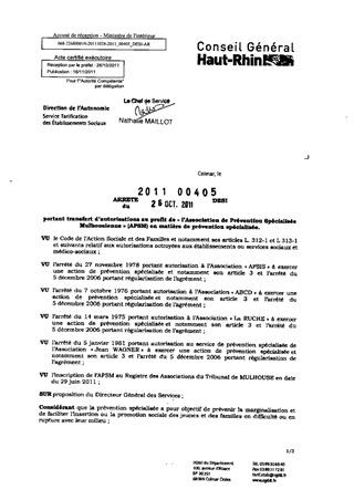 portant transfert d''autorisation au profit de "l'Association de Prévention Spécialisée Mulhousienne" (APSM) en matière de prévention spécialisée. Resumé Pièces jointes ARRETE Assemblée : Non défini Date : 26/10/2011 Rapporteur : Non défini Collectivité : Conseil départemental du Haut-Rhin Direction : Non défini Service : Direction de l'Autonomie Domaine : Autres (non classés) Commission :