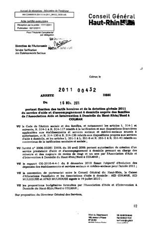 portant fixation des tarifs horaires et de la dotation globale 2011 du service d'aide et d'accompagnement à domicile auprès des familles de l'Association Aide et Intervention à Domicile du Haut-Rhin / Nord à COLMAR. Resumé Pièces jointes ARRETE Assemblée : Non défini Date : 16/11/2011 Rapporteur : Non défini Collectivité : Conseil départemental du Haut-Rhin Direction : Non défini Service : Direction de l'Autonomie Domaine : Dotations financières Commission :