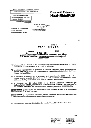portant autorisation d'extension non importante de 4 places de la maison d'enfants à caractère social (MECS) "Le Bercail" à GUEBWILLER. Resumé Pièces jointes ARRETE Assemblée : Non défini Date : 16/11/2011 Rapporteur : Non défini Collectivité : Conseil départemental du Haut-Rhin Direction : Non défini Service : Direction de l'Autonomie Domaine : Autres (non classés) Commission :