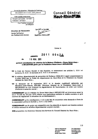 portant autorisation de création de la maison d'enfants "Home Saint-Jean" à MULHOUSE gérée par la Foncation Saint-Jean à MULHOUSE. Resumé Pièces jointes ARRETE Assemblée : Non défini Date : 16/11/2011 Rapporteur : Non défini Collectivité : Conseil départemental du Haut-Rhin Direction : Non défini Service : Direction de l'Autonomie Domaine : Autres (non classés) Commission :
