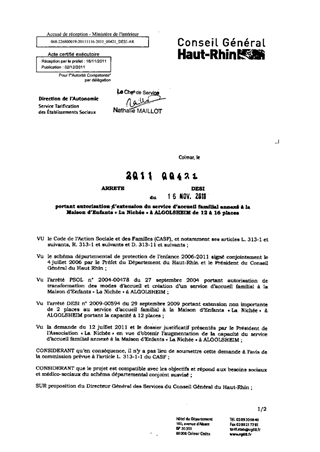 portant autorisation d'extension du service d'accueil familial annexé à la maison d'enfants "La Nichée" à ALGOLSHEIM de 12 à 16 places. Resumé Pièces jointes ARRETE Assemblée : Non défini Date : 16/11/2011 Rapporteur : Non défini Collectivité : Conseil départemental du Haut-Rhin Direction : Non défini Service : Direction de l'Autonomie Domaine : Autres (non classés) Commission :