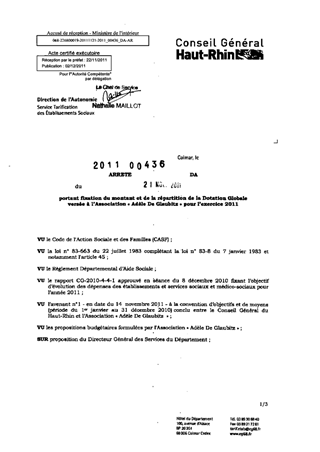 portant fixation du montant et de la répartition de la dotation globale versée à l'association "Adèle de Glaubitz" pour l'exercice 2011. Resumé Pièces jointes ARRETE Assemblée : Non défini Date : 21/11/2011 Rapporteur : Non défini Collectivité : Conseil départemental du Haut-Rhin Direction : Non défini Service : Direction de l'Autonomie Domaine : Dotations financières Commission :