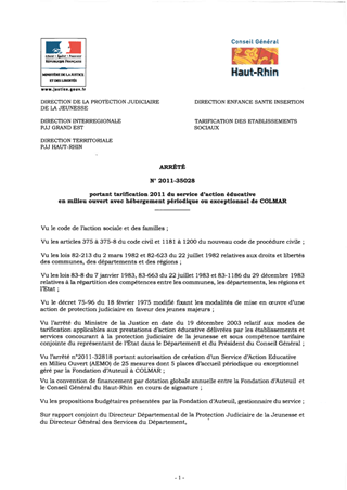 portant tarification 2011 du service d'action éducative en milieu ouvert avec hébergement périodique ou exceptionnel de COLMAR. Resumé Pièces jointes ARRETE Assemblée : Non défini Date : 08/12/2011 Rapporteur : Non défini Collectivité : Conseil départemental du Haut-Rhin Direction : Non défini Service : Direction Enfance Santé Insertion Domaine : Dotations financières Commission :