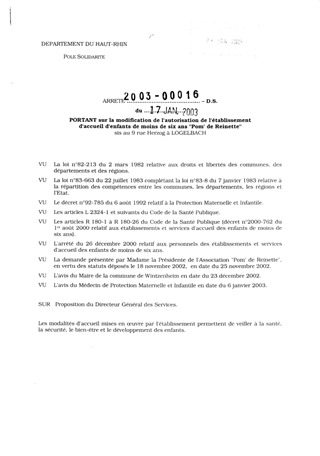 portant sur la modification de l'autorisation de l'établissement d'accueil d'enfants de moins de six ans "Pom' de Reinette" sis au 9 rue Herzog à LOGELBACH. Resumé Pièces jointes ARRETE Assemblée : Non défini Date : 17/01/2003 Rapporteur : Non défini Collectivité : Conseil départemental du Haut-Rhin Direction : Non défini Service : Direction de la Solidarité Domaine : Accueil d'enfants Commission :