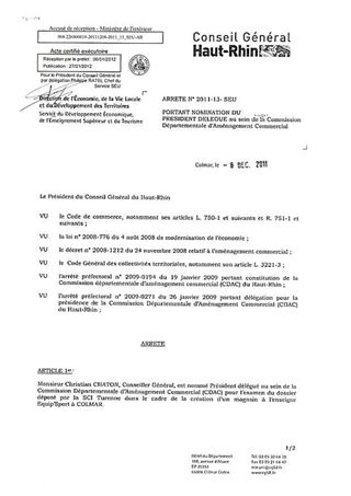 portant nomination du Président délégué au sein de la Commission Départementale d'Aménagement Commercial. Resumé Pièces jointes ARRETE Assemblée : Non défini Date : 08/12/2011 Rapporteur : Non défini Collectivité : Conseil départemental du Haut-Rhin Direction : Non défini Service : Service Développement Economique Domaine : Autres (non classés) Commission :