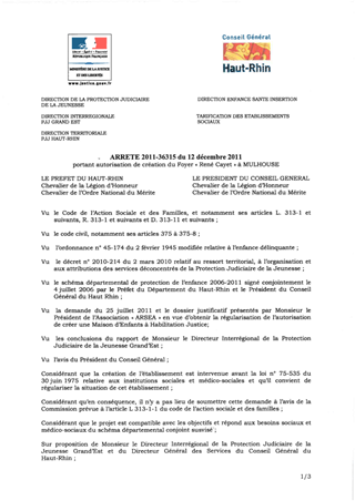 portant autorisation de création du foyer "René Cayet" à MULHOUSE. Resumé Pièces jointes ARRETE Assemblée : Non défini Date : 12/12/2011 Rapporteur : Non défini Collectivité : Conseil départemental du Haut-Rhin Direction : Non défini Service : Direction Enfance Santé Insertion Domaine : Autres (non classés) Commission :