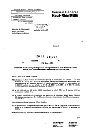 portant fixation des prix de journée hébergement 2012 de la Maison d'Accueil Rurale pour personnes âgées (MARPA) de SEPPOIS LE BAS. Resumé Pièces jointes ARRETE Assemblée : Non défini Date : 20/12/2011 Rapporteur : Non défini Collectivité : Conseil départemental du Haut-Rhin Direction : Non défini Service : Direction de l'Autonomie Domaine : Prix de Journée Commission :