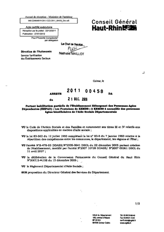 portant habilitation partielle de l'établissement hébergeant des personnes âgées dépendantes (EHPAD) "Les Fontaines de KEMBS" à KEMBS à accueillir des personnes âgées bénéficiaires de l'aide sociale départementale. Resumé Pièces jointes ARRETE Assemblée : Non défini Date : 21/12/2011 Rapporteur : Non défini Collectivité : Conseil départemental du Haut-Rhin Direction : Non défini Service : Direction de l'Autonomie Domaine : Personnes Agées Commission :