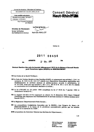 portant fixation des prix de journée hébergement 2012 de la Maison d'Accueil Rurale pour personnes âgées (MARPA) de BRECHAUMONT. Resumé Pièces jointes ARRETE Assemblée : Non défini Date : 21/12/2011 Rapporteur : Non défini Collectivité : Conseil départemental du Haut-Rhin Direction : Non défini Service : Direction de l'Autonomie Domaine : Prix de Journée Commission :