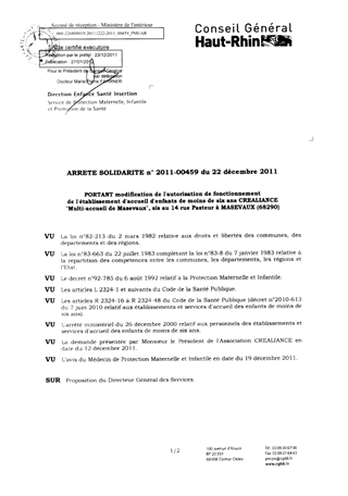 portant modification de l'autorisation de fonctionnement de l'établissement d'accueil d'enfants de moins de six ans CREALLIANCE "Multi-accueil de Masevaux", sis au 14 rue Pasteur à MASEVAUX (68290). Resumé Pièces jointes ARRETE Assemblée : Non défini Date : 22/12/2011 Rapporteur : Non défini Collectivité : Conseil départemental du Haut-Rhin Direction : Non défini Service : Direction Enfance Santé Insertion Domaine : Accueil d'enfants Commission :