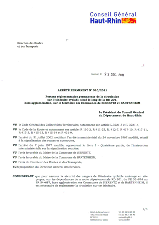 portant réglementation permanente de la circulation sur l'itinéraire cyclable situé le long de la RD 201, hors agglomération, sur le territoire des communes de SIERENTZ et BARTENHEIM. Resumé Pièces jointes ARRETE Assemblée : Non défini Date : 22/12/2011 Rapporteur : Non défini Collectivité : Conseil départemental du Haut-Rhin Direction : Non défini Service : Direction des Routes Domaine : Circulation Commission :