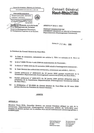 portant nomination du Président délégué au sein de la Commission Départementale d'Aménagement Commercial. Resumé Pièces jointes ARRETE Assemblée : Non défini Date : 22/12/2011 Rapporteur : Non défini Collectivité : Conseil départemental du Haut-Rhin Direction : Non défini Service : Service Développement Economique Domaine : Autres (non classés) Commission :