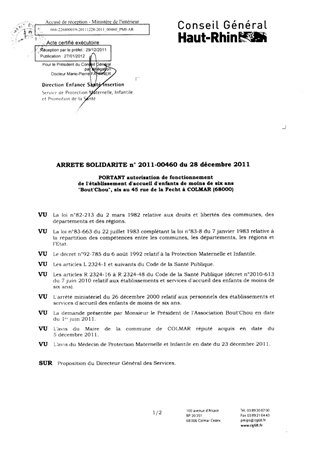 portant autorisation de fonctionnement de l'établissement d'accueil d'enfants de moins de six ans "Bout'Chou", sis au 45 rue de la Fecht à COLMAR (68000). Resumé Pièces jointes ARRETE Assemblée : Non défini Date : 28/12/2011 Rapporteur : Non défini Collectivité : Conseil départemental du Haut-Rhin Direction : Non défini Service : Direction Enfance Santé Insertion Domaine : Accueil d'enfants Commission :