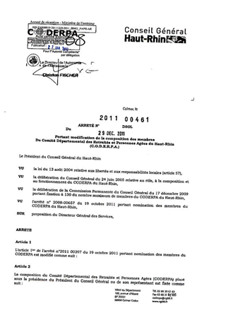 portant modification de la composition des membres du comité départemental des retraitées et personnes âgées du Haut-Rhin (C.O.D.E.R.P.A.). Resumé Pièces jointes ARRETE Assemblée : Non défini Date : 29/12/2011 Rapporteur : Non défini Collectivité : Conseil départemental du Haut-Rhin Direction : Non défini Service : Direction de l'Autonomie Domaine : Autres (non classés) Commission :
