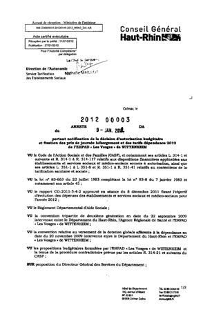 portant notification de la décision d'autorisation budgétaire et fixation des prix de journée hébergement et des tarifs dépendance 2012 de l'EHPAD "Les Vosges" de WITTENHEIM. Resumé Pièces jointes ARRETE Assemblée : Non défini Date : 06/01/2012 Rapporteur : Non défini Collectivité : Conseil départemental du Haut-Rhin Direction : Non défini Service : Direction de l'Autonomie Domaine : Prix de Journée Commission :