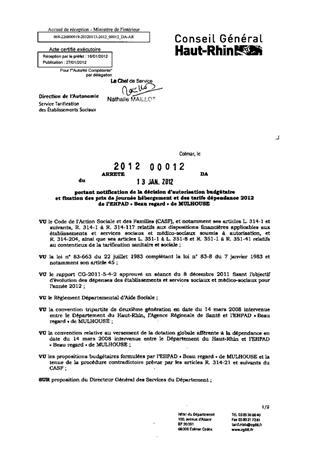 portant notification de la décision d'autorisation budgétaire et fixation des prix de journée hébergement et des tarifs dépendance 2012 de l'EHPAD "Beau regard" de MULHOUSE. Resumé Pièces jointes ARRETE Assemblée : Non défini Date : 13/01/2012 Rapporteur : Non défini Collectivité : Conseil départemental du Haut-Rhin Direction : Non défini Service : Direction de l'Autonomie Domaine : Prix de Journée Commission :