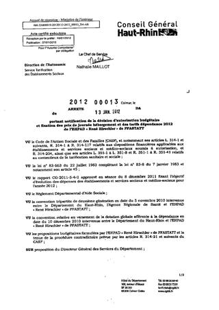 portant notification de la décision d'autorisation budgétaire et fixation des prix de journée hébergement et des tarifs dépendance 2012 de l'EHPAD "René Hirschler" de PFASTATT. Resumé Pièces jointes ARRETE Assemblée : Non défini Date : 13/01/2012 Rapporteur : Non défini Collectivité : Conseil départemental du Haut-Rhin Direction : Non défini Service : Direction de l'Autonomie Domaine : Prix de Journée Commission :