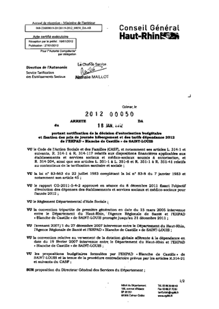 portant notification de la décision d'autorisation budgétaire et fixation des prix de journée hébergement et des tarifs dépendance 2012 de l'EHPAD "Blanche de Castille" de SAINT-LOUIS. Resumé Pièces jointes ARRETE Assemblée : Non défini Date : 18/01/2012 Rapporteur : Non défini Collectivité : Conseil départemental du Haut-Rhin Direction : Non défini Service : Direction de l'Autonomie Domaine : Prix de Journée Commission :