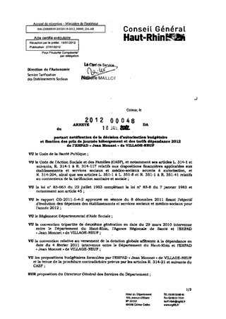 portant notification de la décision d'autorisation budgétaire et fixation des prix de journée hébergement et des tarifs dépendance 2012 de l'EHPAD "Jean Monnet" de VILLAGE-NEUF. Resumé Pièces jointes ARRETE Assemblée : Non défini Date : 18/01/2012 Rapporteur : Non défini Collectivité : Conseil départemental du Haut-Rhin Direction : Non défini Service : Direction de l'Autonomie Domaine : Prix de Journée Commission :