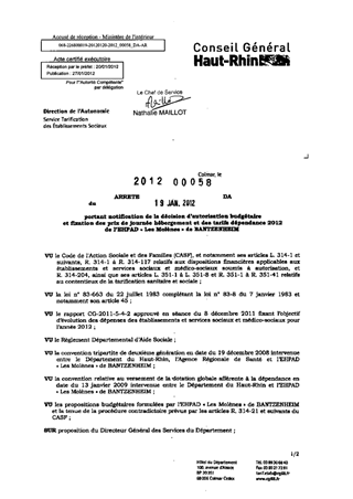 portant notification de la décision d'autorisation budgétaire et fixation des prix de journée hébergement et des tarifs dépendance 2012 de l'EHPAD "Les Molènes" de BANTZENHEIM. Resumé Pièces jointes ARRETE Assemblée : Non défini Date : 19/01/2012 Rapporteur : Non défini Collectivité : Conseil départemental du Haut-Rhin Direction : Non défini Service : Direction de l'Autonomie Domaine : Prix de Journée Commission :