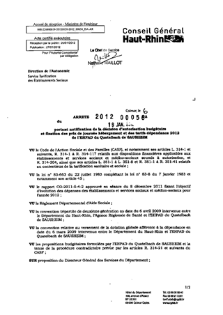 portant notification de la décision d'autorisation budgétaire et fixation des prix de journée hébergement et des tarifs dépendance 2012 de l'EHPAD du Quatelbach de SAUSHEIM. Resumé Pièces jointes ARRETE Assemblée : Non défini Date : 19/01/2012 Rapporteur : Non défini Collectivité : Conseil départemental du Haut-Rhin Direction : Non défini Service : Direction de l'Autonomie Domaine : Prix de Journée Commission :
