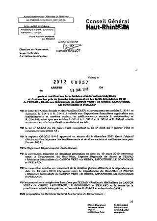 portant notification de la décision d'autorisation budgétaire et fixation des prix de journée hébergement et des tarifs dépendance 2012 de l'EHPAD "Résidence Médicalisée du Canton Vert" de ORBEY, LAPOUTROIE, LE BONHOMME et FRELAND. Resumé Pièces jointes ARRETE Assemblée : Non défini Date : 19/01/2012 Rapporteur : Non défini Collectivité : Conseil départemental du Haut-Rhin Direction : Non défini Service : Direction de l'Autonomie Domaine : Prix de Journée Commission :