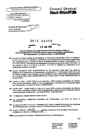 portant fixation des tarifs horaires 2012 du service d'aide et d'accompagnement à domicile pour les personnes adultes handicapées de l'association "Le Droit de Vivre" à MULHOUSE. Resumé Pièces jointes ARRETE Assemblée : Non défini Date : 23/01/2012 Rapporteur : Non défini Collectivité : Conseil départemental du Haut-Rhin Direction : Non défini Service : Direction de l'Autonomie Domaine : Prix de Journée Commission :