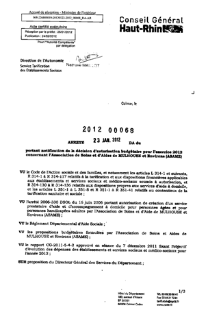 portant notification de la décision d'autorisation budgétaire pour l'exercice 2012 concernant l'Association Soins et d'Aides de MULHOUSE et Environs (ASAME). Resumé Pièces jointes ARRETE Assemblée : Non défini Date : 23/01/2012 Rapporteur : Non défini Collectivité : Conseil départemental du Haut-Rhin Direction : Non défini Service : Direction de l'Autonomie Domaine : Dotations financières Commission :