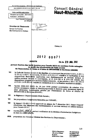 portant fixation des tarifs horaires 2012 des services d'aide ménagère au profit des bénéficiaires de l'aide sociale de l'association de soins et d'aides de MULHOUSE et Environs (ASAME). Resumé Pièces jointes ARRETE Assemblée : Non défini Date : 23/01/2012 Rapporteur : Non défini Collectivité : Conseil départemental du Haut-Rhin Direction : Non défini Service : Direction de l'Autonomie Domaine : Dotations financières Commission :
