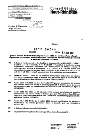 portant fixation des tarifs horaires pour l'année 2012 des services d'aide ménagère au profit des bénéficiaires de l'aide sociale de l'association pour l'accompagnement et le maintien à domicile (APAMAD). Resumé Pièces jointes ARRETE Assemblée : Non défini Date : 23/01/2012 Rapporteur : Non défini Collectivité : Conseil départemental du Haut-Rhin Direction : Non défini Service : Direction de l'Autonomie Domaine : Prix de Journée Commission :