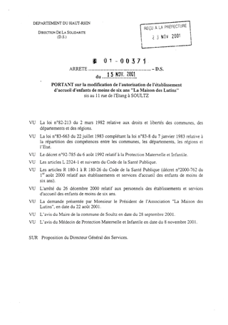 portant sur la modification de l'autorisation de l'établissement d'accueil d'enfants de moins de six ans "La Maison des Lutins" sis au 11 rue de l'Etang à Soultz Resumé Pièces jointes ARRETE Assemblée : Non défini Date : 15/11/2001 Rapporteur : Non défini Collectivité : Conseil départemental du Haut-Rhin Direction : Non défini Service : Direction de la Solidarité Domaine : Accueil d'enfants Commission :