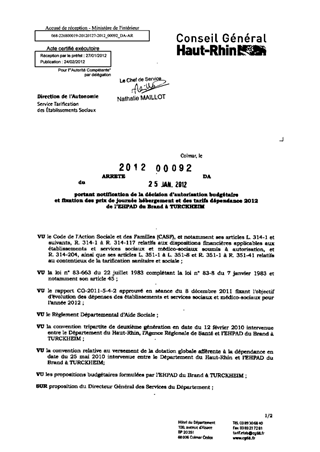 portant notification de la décision d'autorisation budgétaire et fixation des prix de journée hébergement et des tarifs dépendance 2012 de l'EHPAD du Brand à TURCKHEIM. Resumé Pièces jointes ARRETE Assemblée : Non défini Date : 25/01/2012 Rapporteur : Non défini Collectivité : Conseil départemental du Haut-Rhin Direction : Non défini Service : Direction de l'Autonomie Domaine : Prix de Journée Commission :
