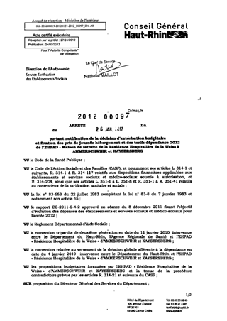 portant notification de la décision d'autorisation budgétaire et fixation des prix de journée hébergement et des tarifs dépendance 2012 de l'EHPAD - Maison de retraite de la résidence hospitalière de la Weiss à AMMERSCHWIHR et KAYSERSBERG. Resumé Pièces jointes ARRETE Assemblée : Non défini Date : 26/01/2012 Rapporteur : Non défini Collectivité : Conseil départemental du Haut-Rhin Direction : Non défini Service : Direction de l'Autonomie Domaine : Prix de Journée Commission :