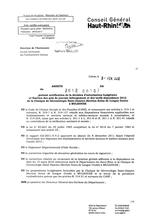 portant notification de la décision d'autorisation budgétaire et fixation des prix de journée hébergement et des tarifs dépendance 2012 de la clinique de gérontologie Saint-Damien (section soins de longue durée) à MULHOUSE. Resumé Pièces jointes ARRETE Assemblée : Non défini Date : 03/02/2012 Rapporteur : Non défini Collectivité : Conseil départemental du Haut-Rhin Direction : Non défini Service : Direction de l'Autonomie Domaine : Prix de Journée Commission :