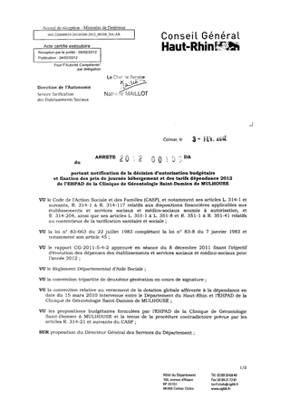 portant notification de la décision d'autorisation budgétaire et fixation des prix de journée hébergement et des tarifs dépendance 2012 de l'EHPAD de la clinique de gérontologie Saint-Damien de MULHOUSE. Resumé Pièces jointes ARRETE Assemblée : Non défini Date : 03/02/2012 Rapporteur : Non défini Collectivité : Conseil départemental du Haut-Rhin Direction : Non défini Service : Direction de l'Autonomie Domaine : Prix de Journée Commission :