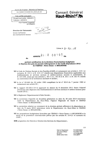 portant notification de la décision d'autorisation budgétaire et fixation des prix de journée hébergement et des tarifs dépendance 2012 de l'EHPAD "Notre Dame" à MULHOUSE. Resumé Pièces jointes ARRETE Assemblée : Non défini Date : 03/02/2012 Rapporteur : Non défini Collectivité : Conseil départemental du Haut-Rhin Direction : Non défini Service : Direction de l'Autonomie Domaine : Prix de Journée Commission :