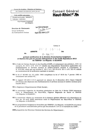 portant notification de la décision d'autorisation budgétaire et fixation des prix de journée hébergement et des tarifs dépendance 2012 de l'EHPAD "Le Séquoïa" à ILLZACH. Resumé Pièces jointes ARRETE Assemblée : Non défini Date : 07/02/2012 Rapporteur : Non défini Collectivité : Conseil départemental du Haut-Rhin Direction : Non défini Service : Direction de l'Autonomie Domaine : Prix de Journée Commission :