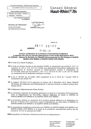 portant notification de la décision d'autorisation budgétaire et fixation des prix de journée hébergement et des tarifs dépendance 2012 de l'EHPAD - Maison de retraite de l'hôpital intercommunal du Val d'Argent à SAINTE-MARIE-AUX-MINES et SAINTE-CROIX-AUX