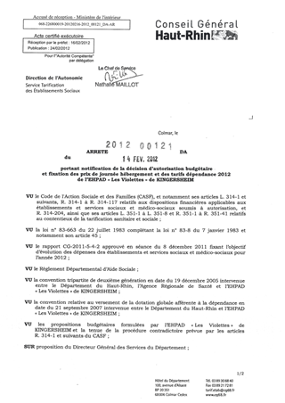 portant notification de la décision d'autorisation budgétaire et fixation des prix de journée hébergement et des tarifs dépendance 2012 de l'EHPAD "Les Violettes" de KINGERSHEIM. Resumé Pièces jointes ARRETE Assemblée : Non défini Date : 14/02/2012 Rapporteur : Non défini Collectivité : Conseil départemental du Haut-Rhin Direction : Non défini Service : Direction de l'Autonomie Domaine : Prix de Journée Commission :
