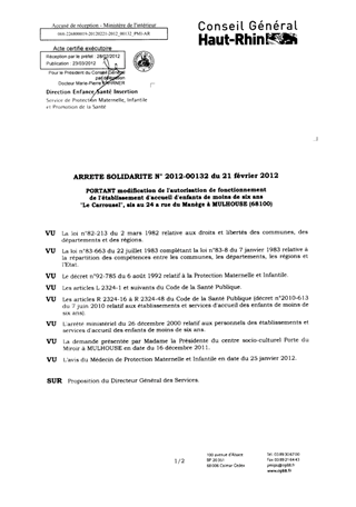 portant modification de l'autorisation de fonctionnement de l'établissement d'accueil d'enfants de moins de six ans "Le Carrousel", sis au 24 a rue du Manège à MULHOUSE (68100). Resumé Pièces jointes ARRETE Assemblée : Non défini Date : 21/02/2012 Rapporteur : Non défini Collectivité : Conseil départemental du Haut-Rhin Direction : Non défini Service : Direction Enfance Santé Insertion Domaine : Accueil d'enfants Commission :