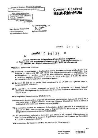 portant notification de la décision d'autorisation budgétaire et fixation des prix de journée hébergement et des tarifs dépendance 2012 de l'EHPAD de l'Hôpital Intercommunal de SOULTZ-ISSENHEIM. Resumé Pièces jointes ARRETE Assemblée : Non défini Date : 23/02/2012 Rapporteur : Non défini Collectivité : Conseil départemental du Haut-Rhin Direction : Non défini Service : Direction de l'Autonomie Domaine : Prix de Journée Commission :