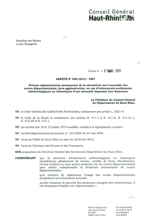 portant réglementation permanente de la circulation sur l'ensemble des routes départementales, hors agglomération, en cas d'événements accidentesl, météorologiques ou climatiques d'une intensité imposant leur fermeture. Resumé Pièces jointes ARRETE Assemblée : Non défini Date : 07/03/2012 Rapporteur : Non défini Collectivité : Conseil départemental du Haut-Rhin Direction : Non défini Service : Direction des Routes Domaine : Circulation Commission :