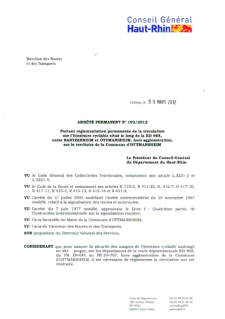 portant réglementation permanente de la circulation sur l'itinéraire cyclable situé le long de la RD 468, entre BANTZENHEIM et OTTMARSHEIM, hors agglomération, sur le territoire de la commune d'OTTMARSHEIM. Resumé Pièces jointes ARRETE Assemblée : Non défini Date : 09/03/2012 Rapporteur : Non défini Collectivité : Conseil départemental du Haut-Rhin Direction : Non défini Service : Direction des Routes Domaine : Circulation Commission :