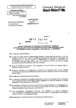 portant notification de la décision d'autorisation budgétaire et fixation des prix de journée hébergement et des tarifs dépendance 2012 de l'EHPAD du centre hospitalier "Saint-Morand" à ALTKIRCH. Resumé Pièces jointes ARRETE Assemblée : Non défini Date : 13/03/2012 Rapporteur : Non défini Collectivité : Conseil départemental du Haut-Rhin Direction : Non défini Service : Direction de l'Autonomie Domaine : Prix de Journée Commission :