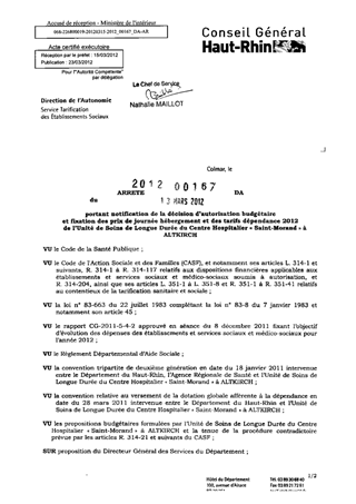 portant notification de la décision d'autorisation budgétaire et fixation des prix de journée hébergement et des tarifs dépendance 2012 de l'unité de soins de longue durée du centre hospitalier "Saint-Morand" à ALTKIRCH. Resumé Pièces jointes ARRETE Assemblée : Non défini Date : 13/03/2012 Rapporteur : Non défini Collectivité : Conseil départemental du Haut-Rhin Direction : Non défini Service : Direction de l'Autonomie Domaine : Prix de Journée Commission :