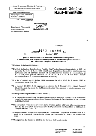 portant notification de la décision d'autorisation budgétaire et fixation des prix de journée hébergement et des tarifs dépendance 2012 de l'EHPAD de l'hôpital de RIBEAUVILLE. Resumé Pièces jointes ARRETE Assemblée : Non défini Date : 14/03/2012 Rapporteur : Non défini Collectivité : Conseil départemental du Haut-Rhin Direction : Non défini Service : Direction de l'Autonomie Domaine : Prix de Journée Commission :